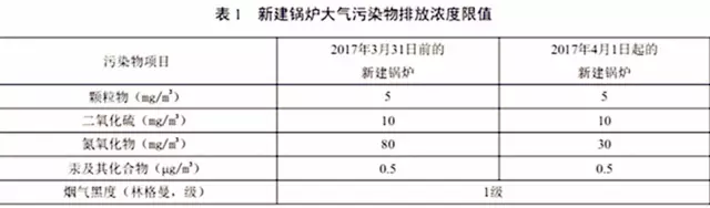 根據(jù)新標準,自2017年4月1日起,新建鍋爐必須低于30毫克/立方米,在用的必須低于80毫克/立方米。(表1、表2)