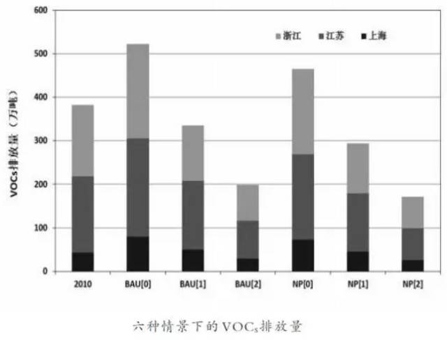 (4)2010年,長三角地區的VOCs排放量約382.2萬噸,在現有政策和現有執行力度下(BAU[0]情景),到2030年會增長37%,達到522.0萬噸。通過采用一系列節能措施,在NP[0]情景下,2030年VOCs排放量為464.9萬噸,比2010年仍然高22%。通過進一步采用******估計的污染控制措施(NP[1]情景),VOCs排放量會進一步減少到293.8萬噸,比2010年降低23%。在******減排潛力控制策略情景下(NP[2]情景),2030年的排放量為171.5萬噸,相當于2010年的45%。