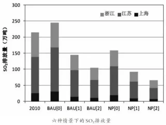 (1)2010年,長三角地區的二氧化硫排放量約214.7萬噸,在現有政策和現有執行力度下(BAU[0]情景),到2030年會增長14%,達到244.8萬噸。通過采用一系列節能措施,在NP[0]情景下,2030年二氧化硫排放量會減少到157.9萬噸,比2010年降低26%。通過進一步采用******估計的污染控制措施(NP[1]情景),二氧化硫排放量會進一步減少到92.6萬噸,比2010年降低57%。在******減排潛力控制策略情景下(NP[2]情景),2030年的排放量為65.5萬噸,僅相當于2010年的31%。