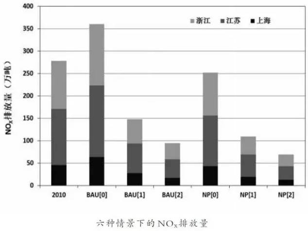 (2)2010年,長三角地區的NOx排放量約277.7萬噸,在現有政策和現有執行力度下(BAU[0]情景),到2030年會增長30%,達到360.3萬噸。通過采用一系列節能措施,在NP[0]情景下,2030年NOx排放量會略低于2010年,為251.3萬噸。通過進一步采用******估計的污染控制措施(NP[1]情景),NOx排放量會進一步減少到108.7萬噸,比2010年降低61%。在******減排潛力控制策略情景下(NP[2]情景),2030年的排放量為69.1萬噸,僅相當于2010年的25%。