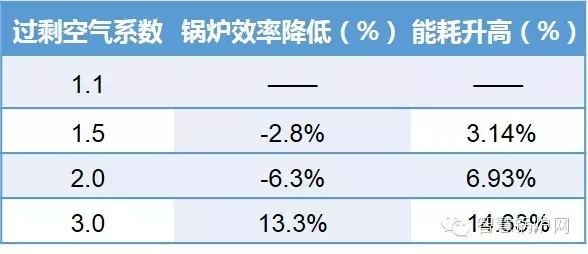 ①空燃比對(duì)加熱爐效率的影響:主要表現(xiàn)在空氣過量燃燒時(shí),將會(huì)有大量多余的冷空氣被加熱,造成燃燒效率下降,能耗上升。而欠氧燃燒時(shí),會(huì)造成不完全燃燒損失、鍋爐積碳、CO超標(biāo),甚至有部分燃料還未燃燒就排放出去,造成能耗上升及嚴(yán)重的運(yùn)行安全隱患。不合理的空燃比對(duì)加熱爐能效的影響非常大,在設(shè)定排煙溫度165℃下,空燃比對(duì)加熱爐能耗的影響可參見下表: